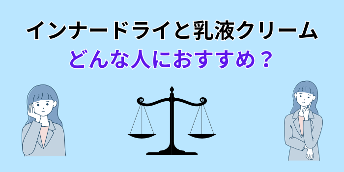今回は、インナードライ肌における乳液とクリームの違いを徹底比較し、どちらがどんな人におすすめかについて解説しています。